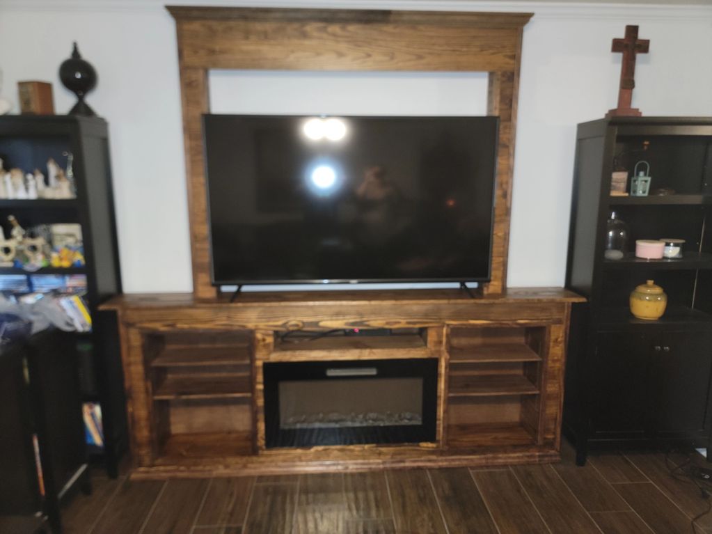 This entertainment center can be modified to fit your specific TV. Contains adjustable shelves, a shelf for various boxes, and electric fireplace.